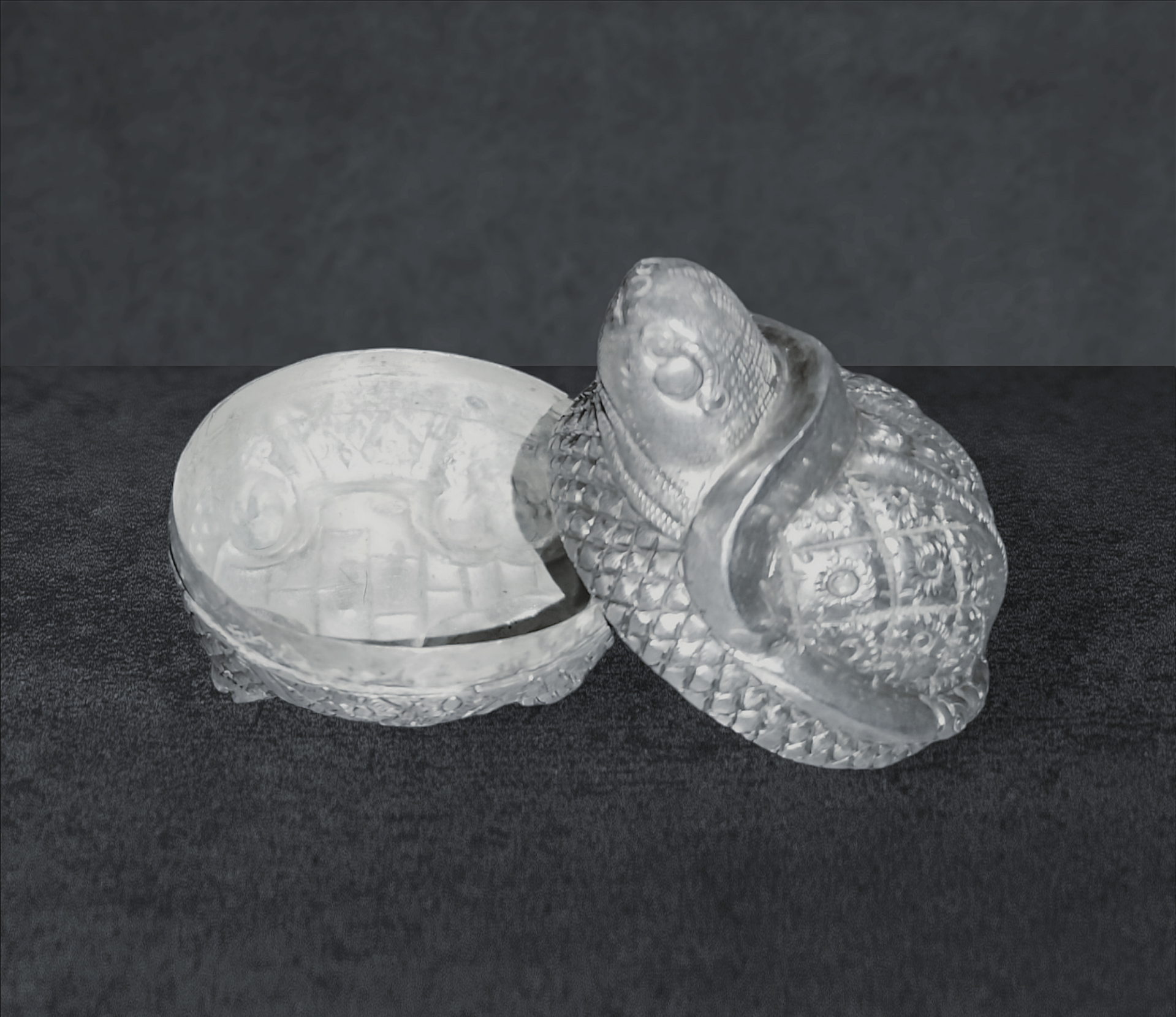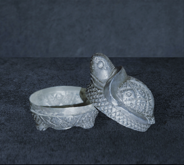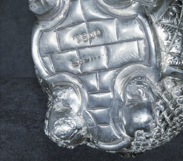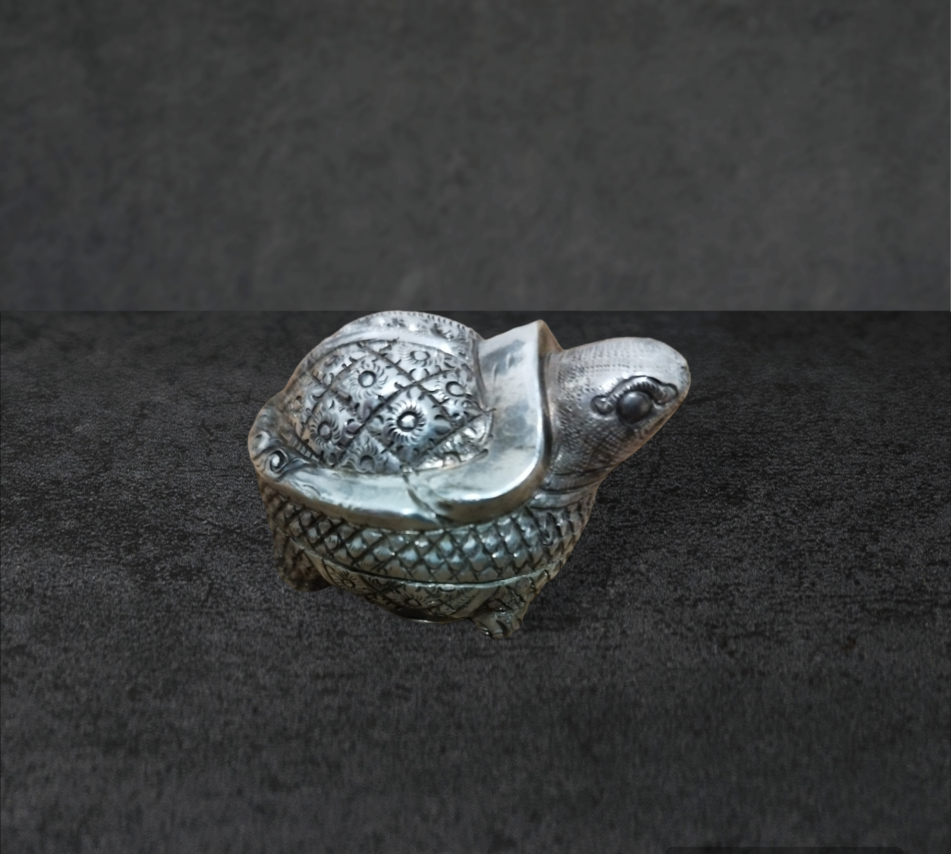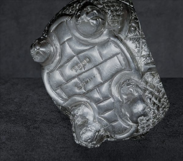 Un stimulant doux utilisé depuis des siècles dans toute l'Asie du Sud-Est. Bien que de telles pièces en argent soient difficiles à dater, celle-ci, à en juger par la conception et les détails, a été fabriquée au début du XXe siècle. Chaque surface, même la plante des pieds, est détaillée, avec une attention exceptionnelle à la tête, où plus d'une douzaine de motifs de lignes se combinent avec des formes nettes pour former l'expression vivante des Tortue. boîtes en argent étaient très appréciées par leurs propriétaires, elles ont été soigneusement manipulées et restent généralement en bon état. Celui-ci est en assez bon état, sans bosses.