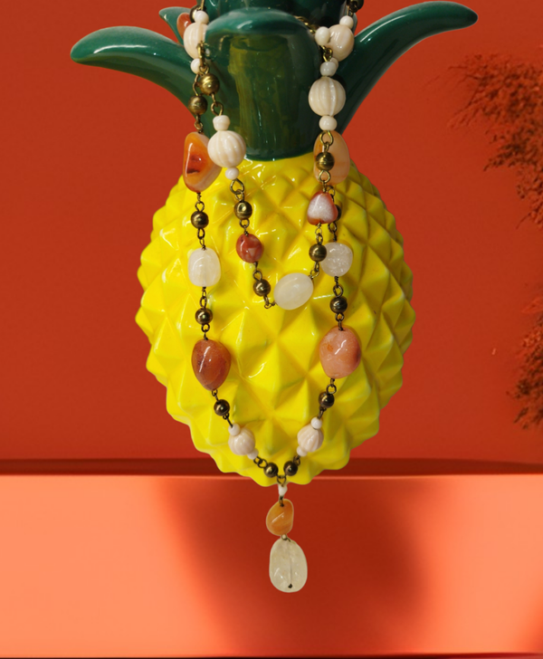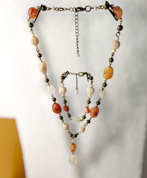 Kina est un joli parure vintage original aux couleurs douces par ses pierres naturelles et le métal couleur bronze. Il est monté avec des perles Quartz & Cornaline et quartz blanc et en quartz rose et perles rose en porcelaine kina. Le tout avec perles et apprêts en métal couleur bronze.