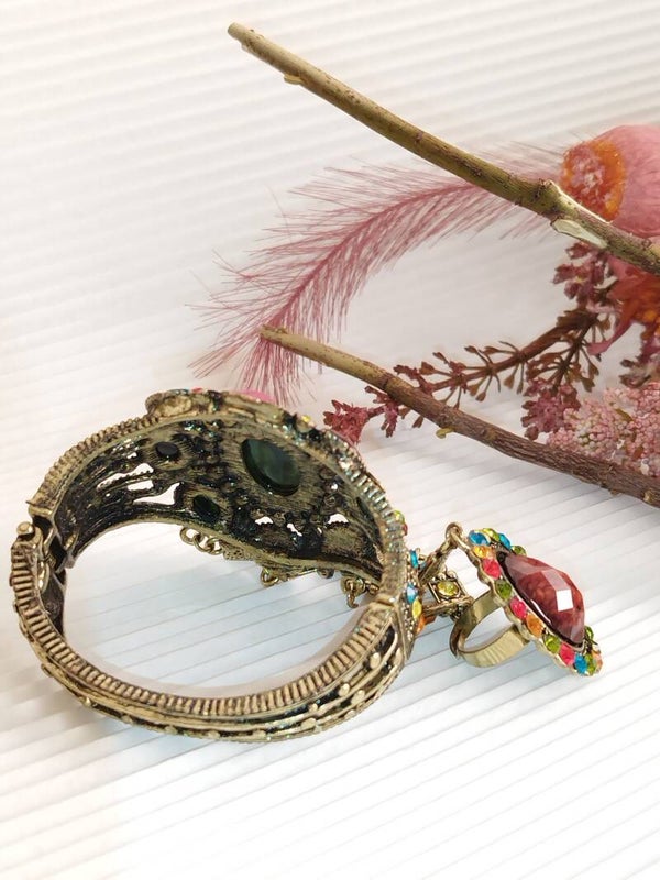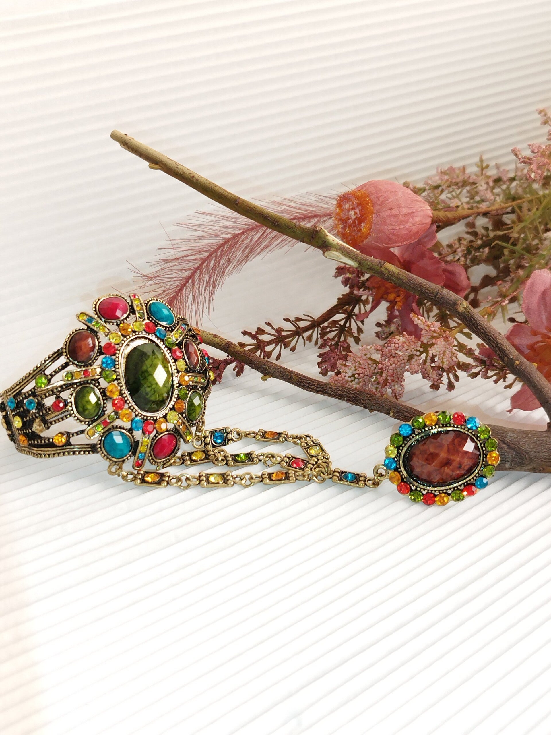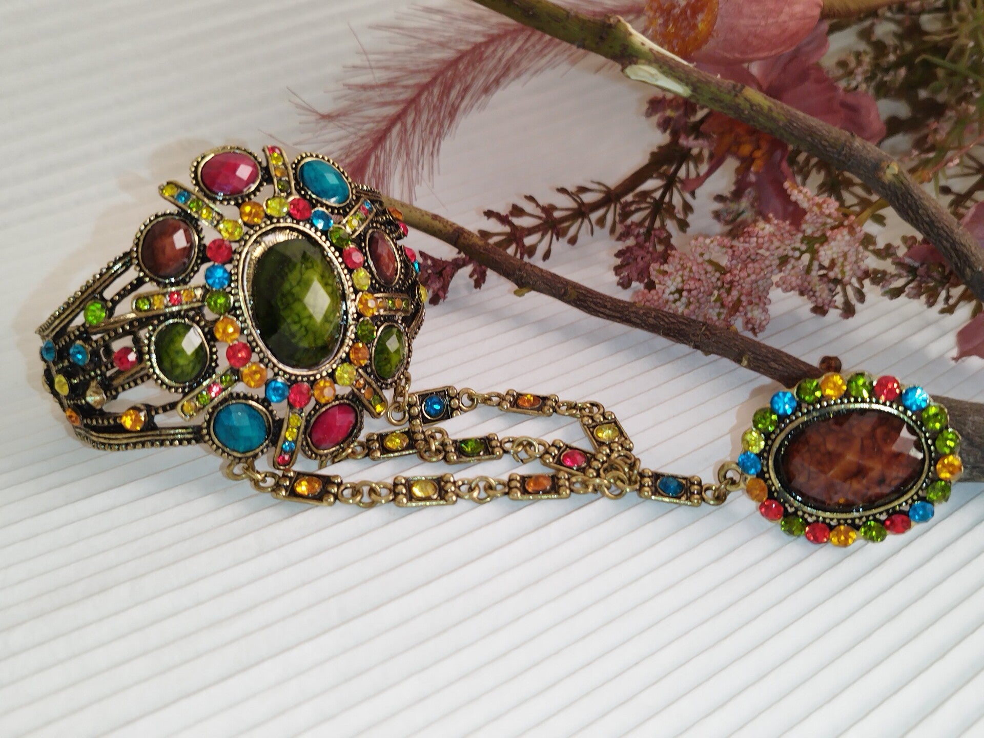 Bracelet femme chaîne à main métal bracelet bague connectée perles multicolores, état neuf