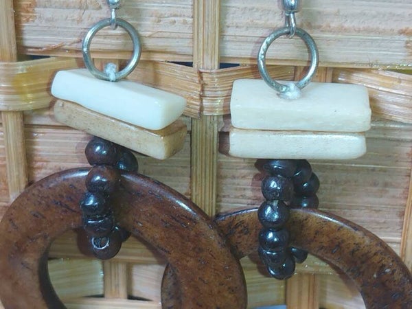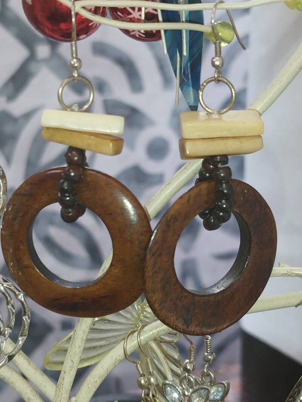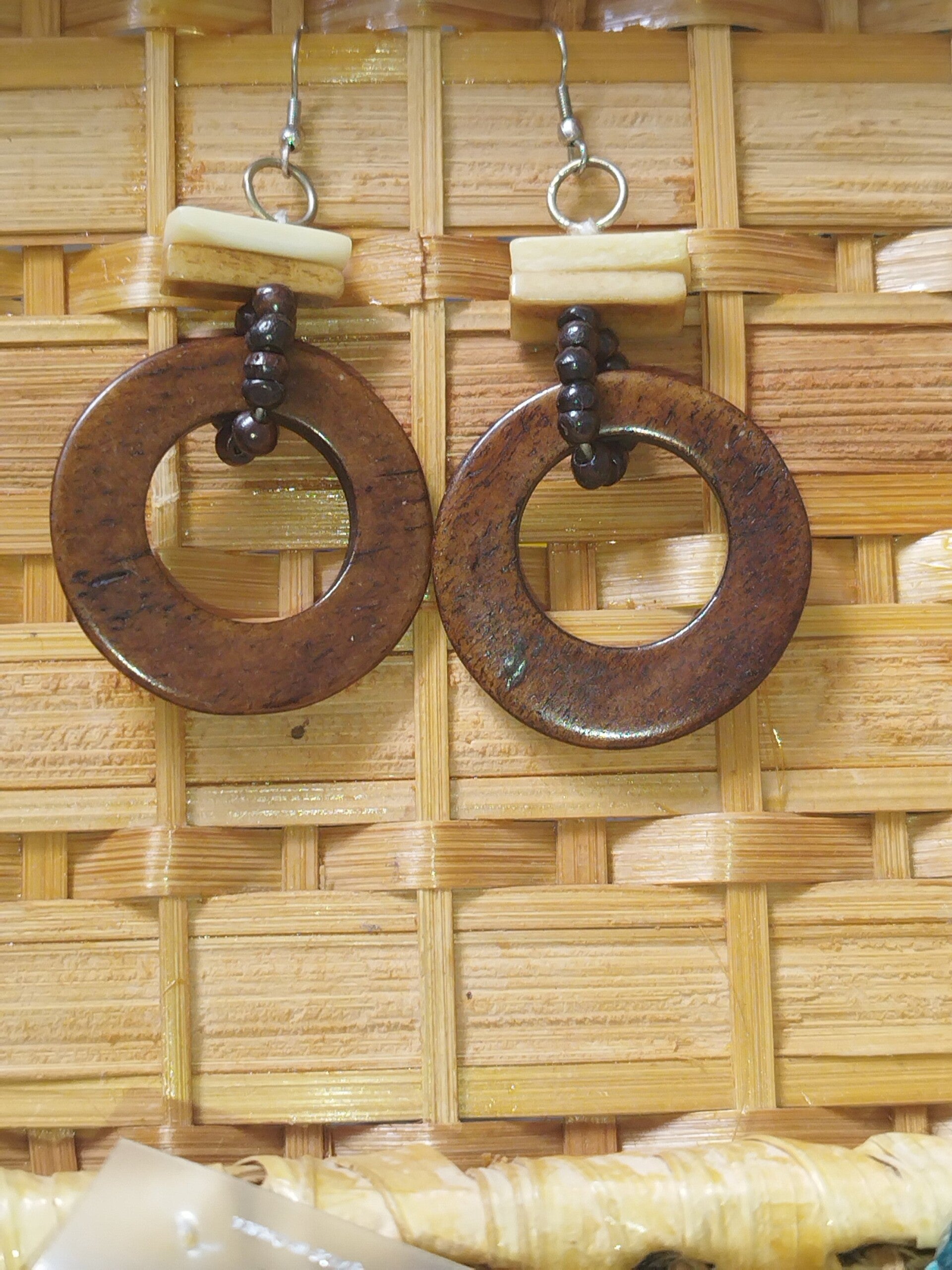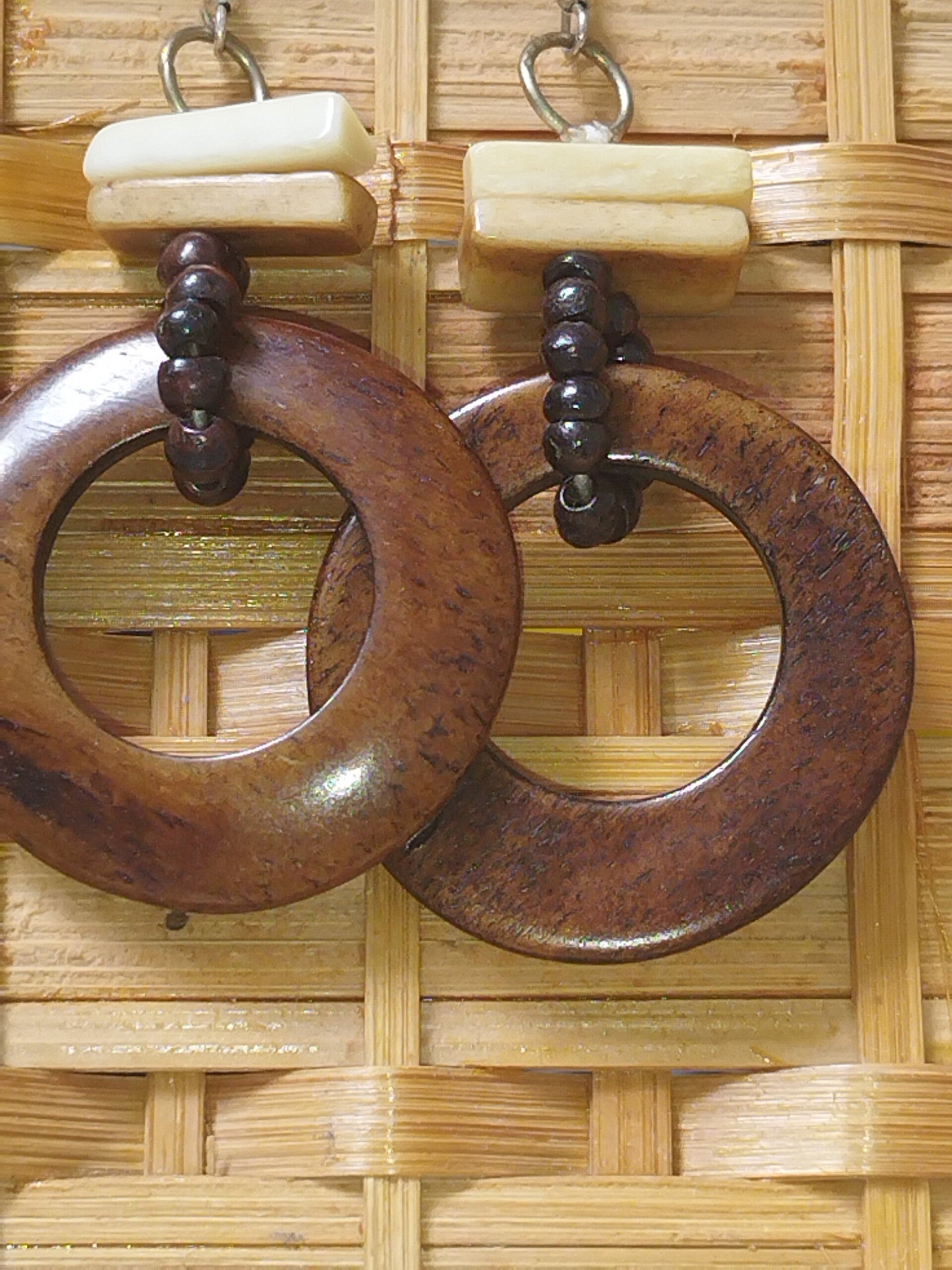 boucles d'oreilles vintage rondes en bois et jade jaune brut naturel cristal