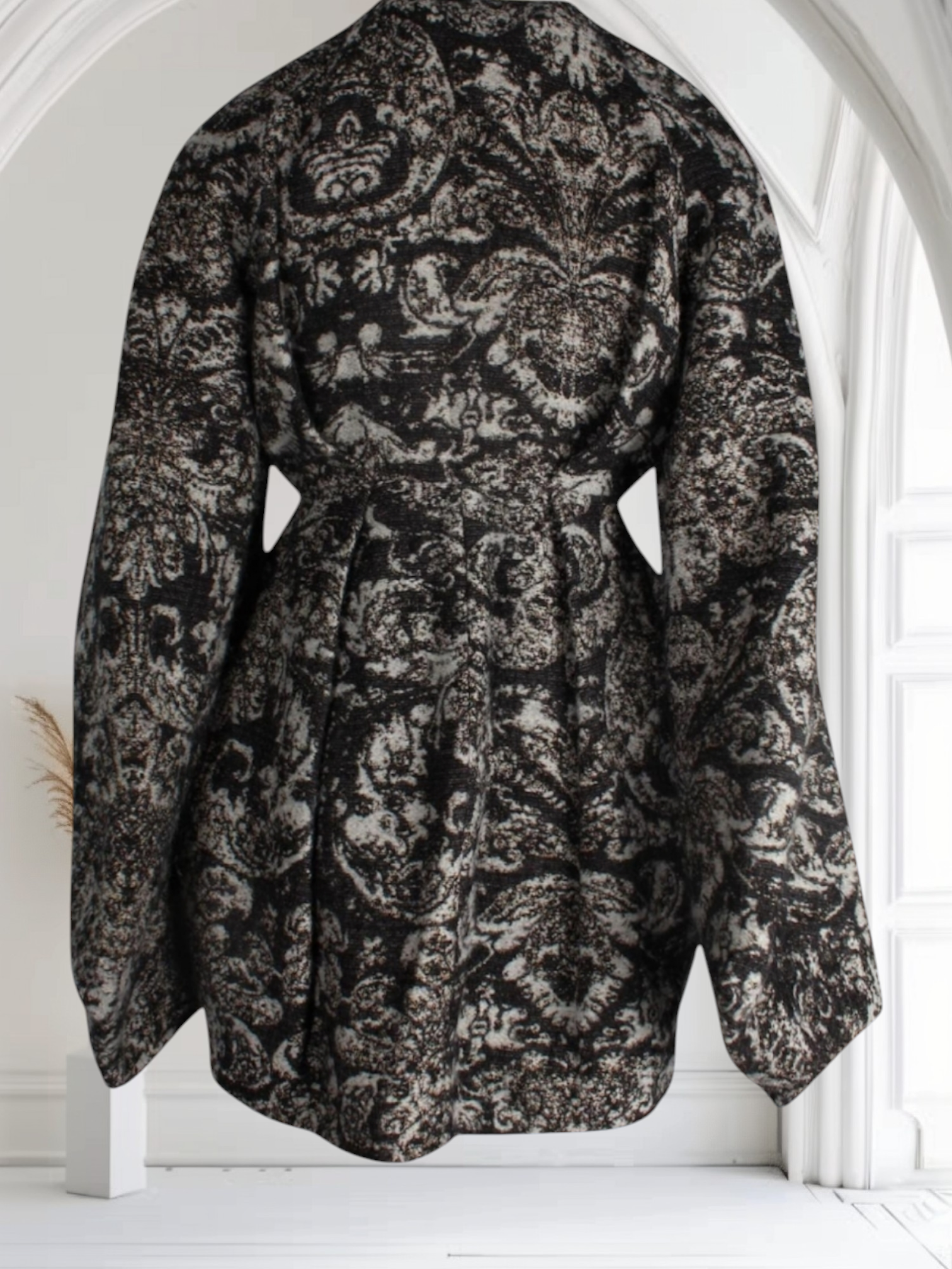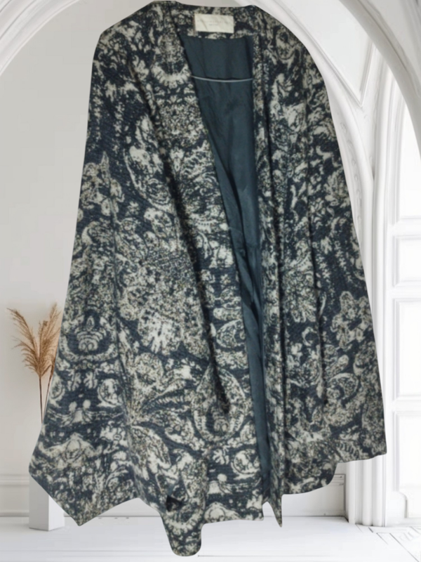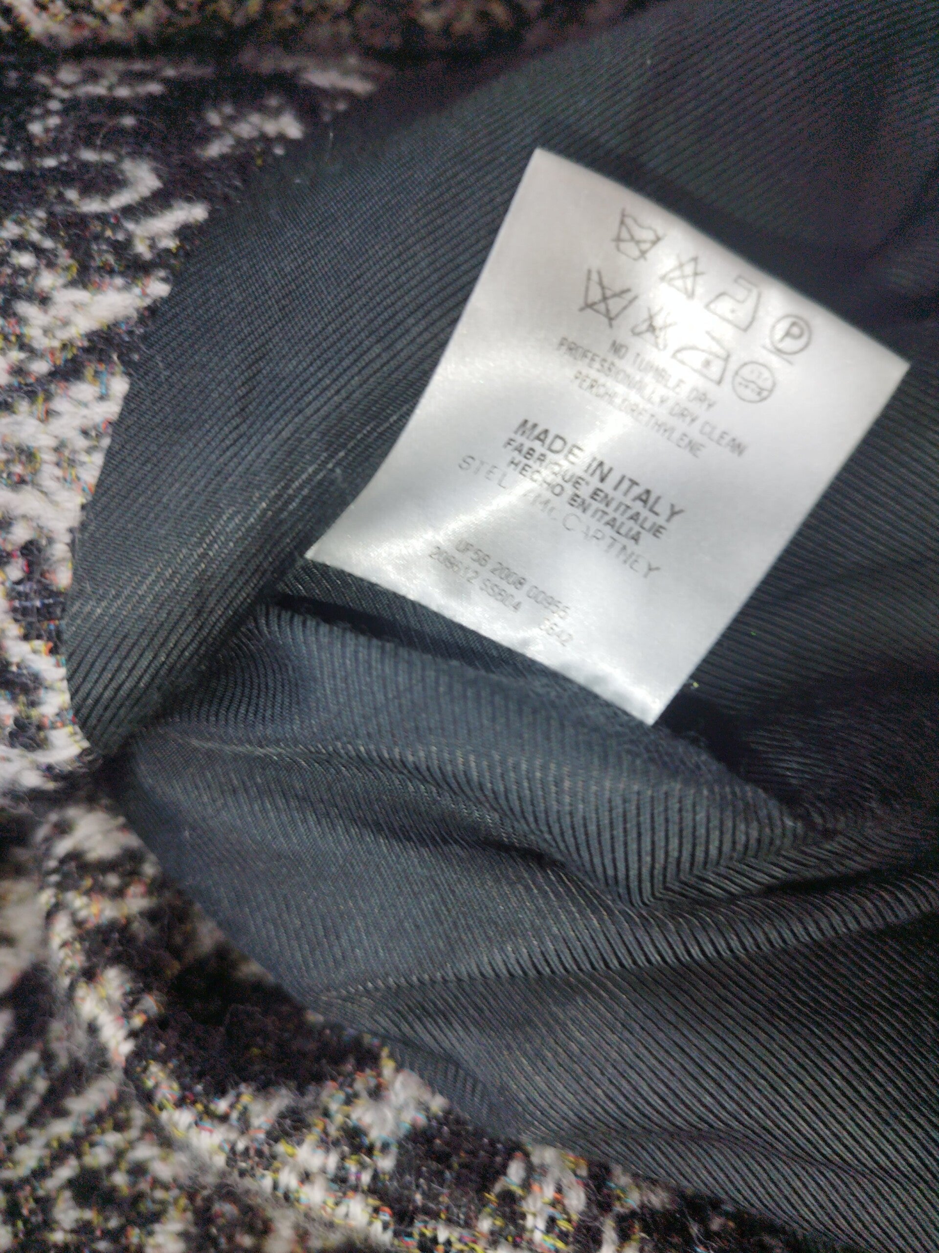 Une version surélevée du manteau classique, cette pièce de Stella McCartney est confectionnée dans un mélange de laine grise à motifs riches et présente de larges fronces à la taille sur le devant et dans le dos. Le manteau présente des manches kimono oversizees et un col en V profond, ainsi qu'une fermeture à crochet centrale sur le devant. Très bon état marqué taille 46, convient taille 38 et 40