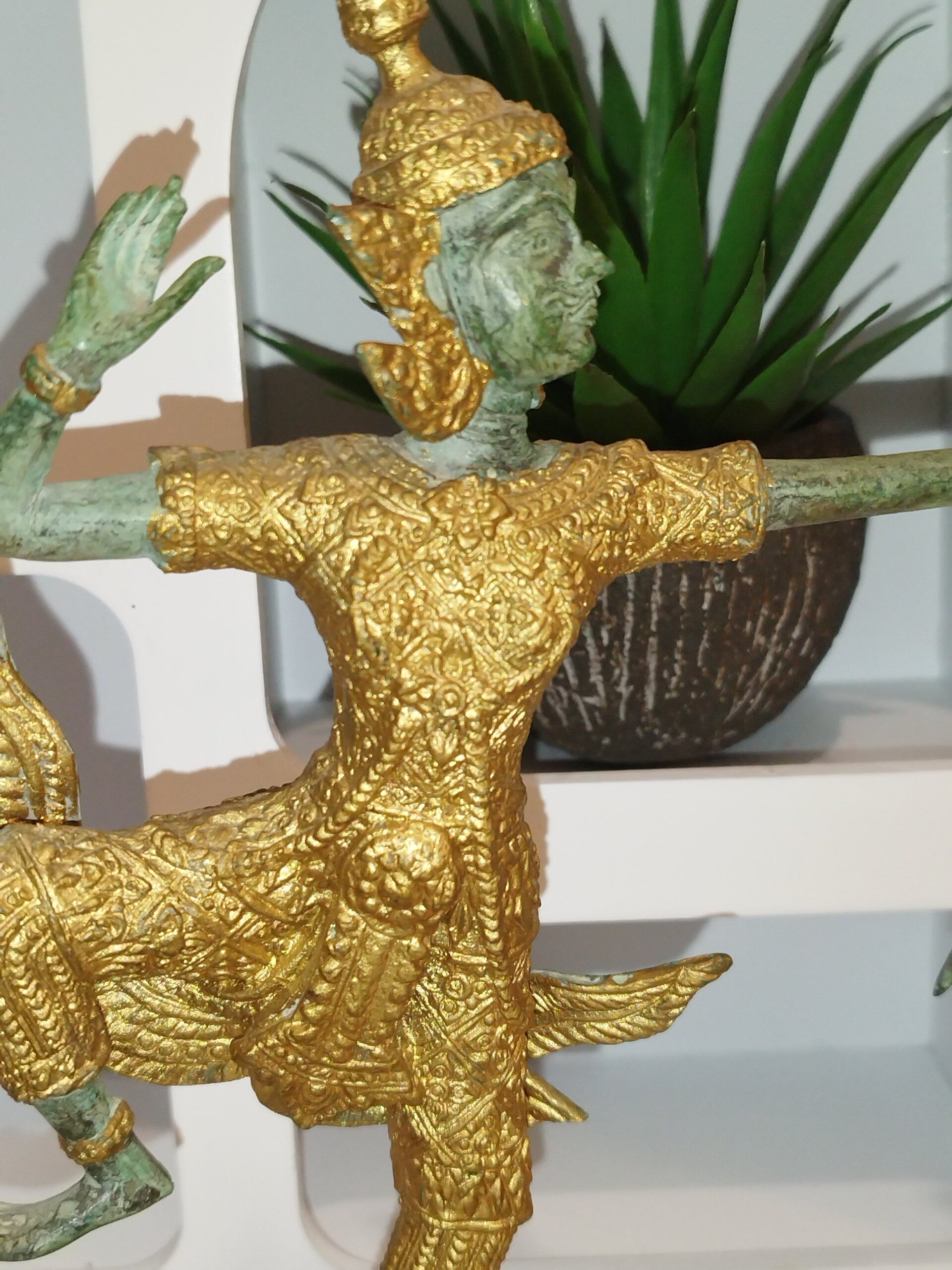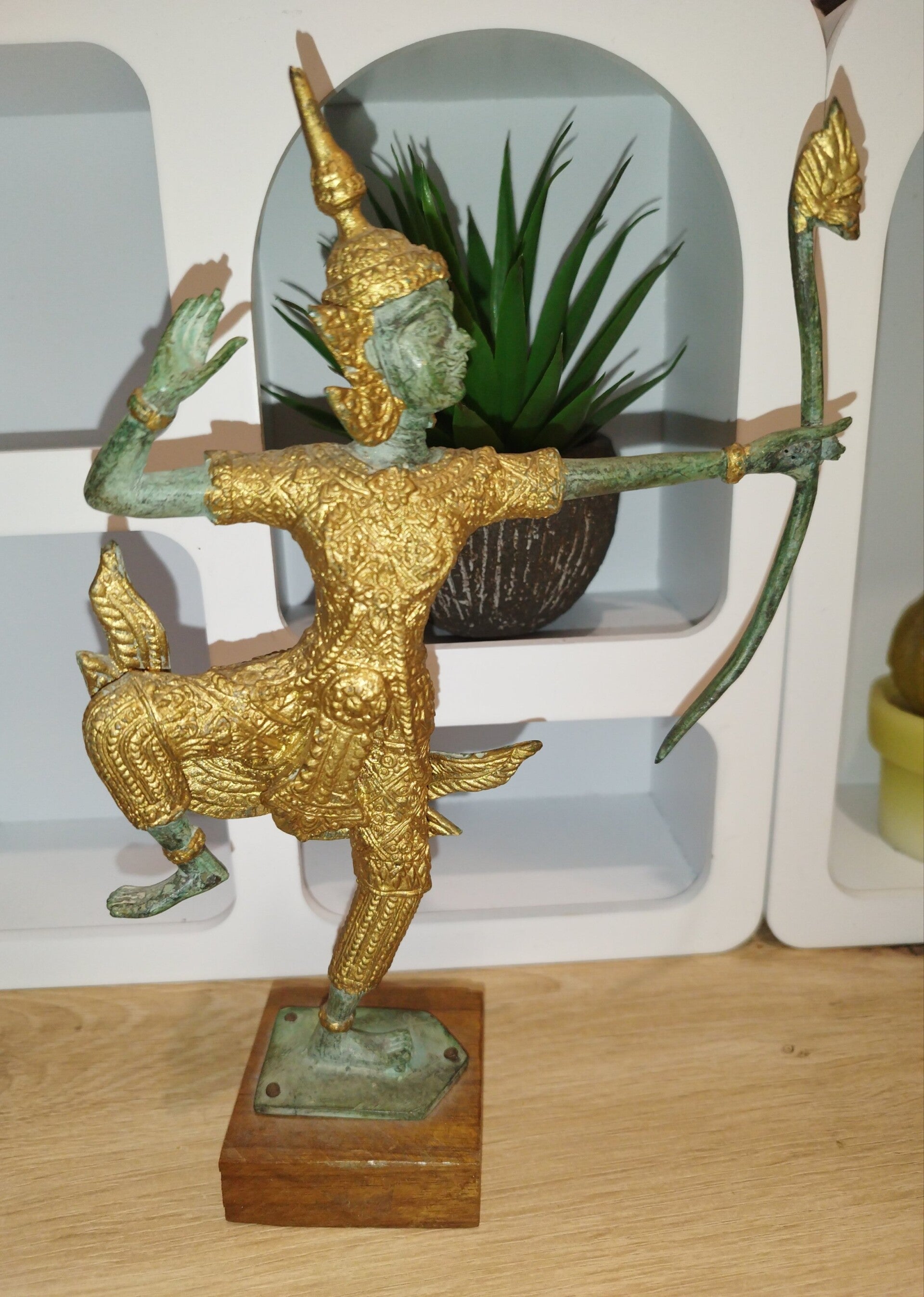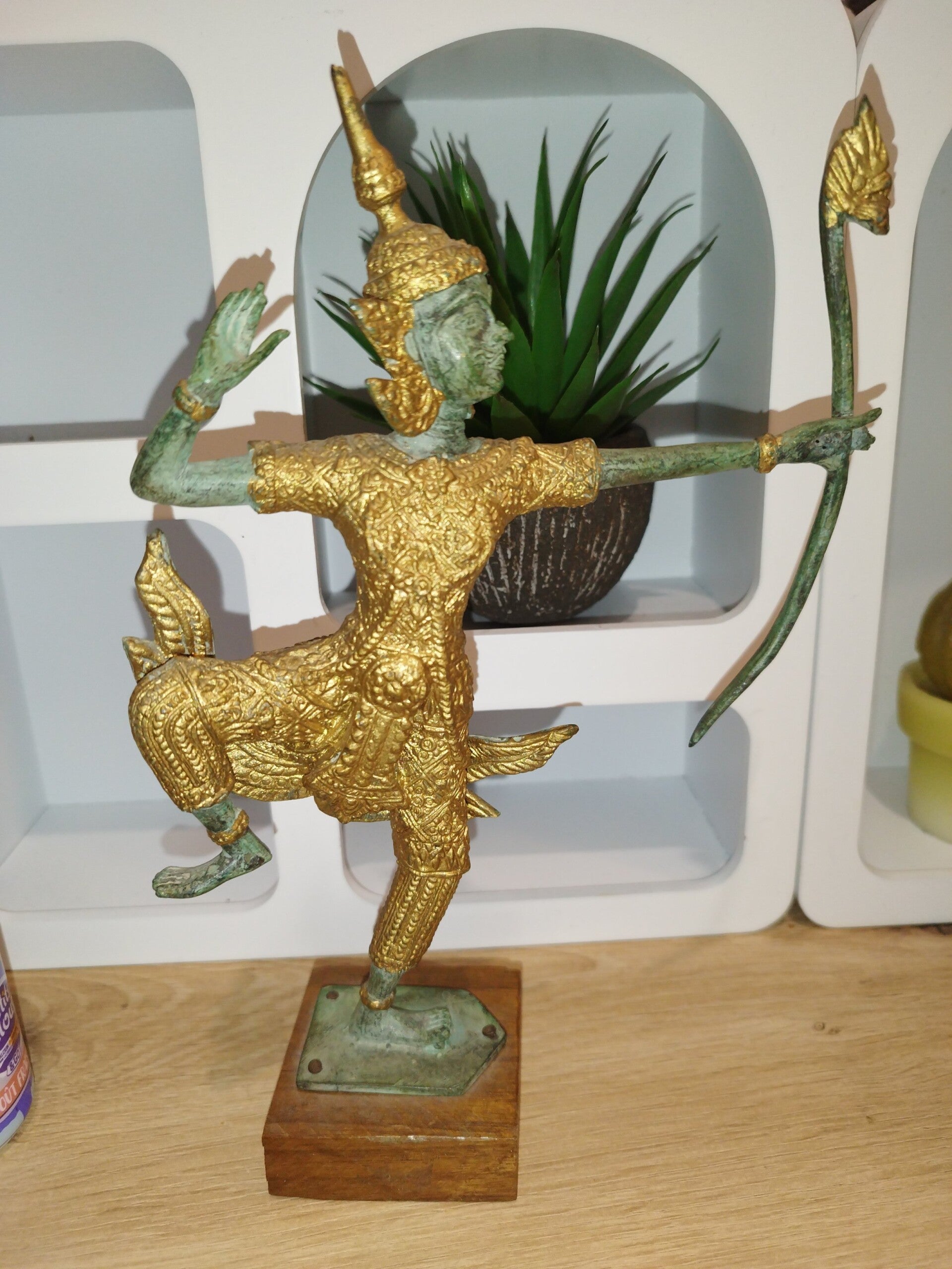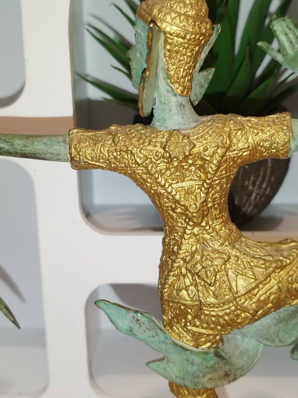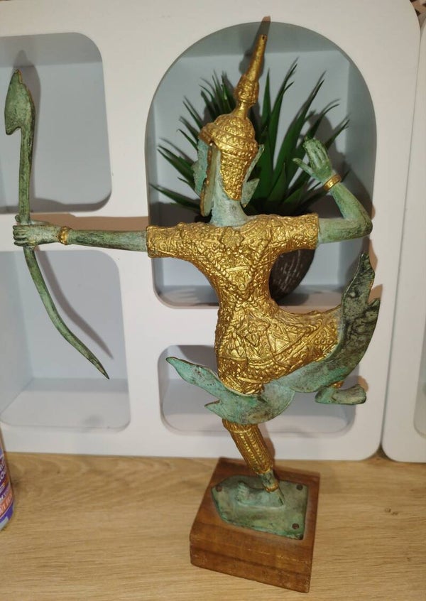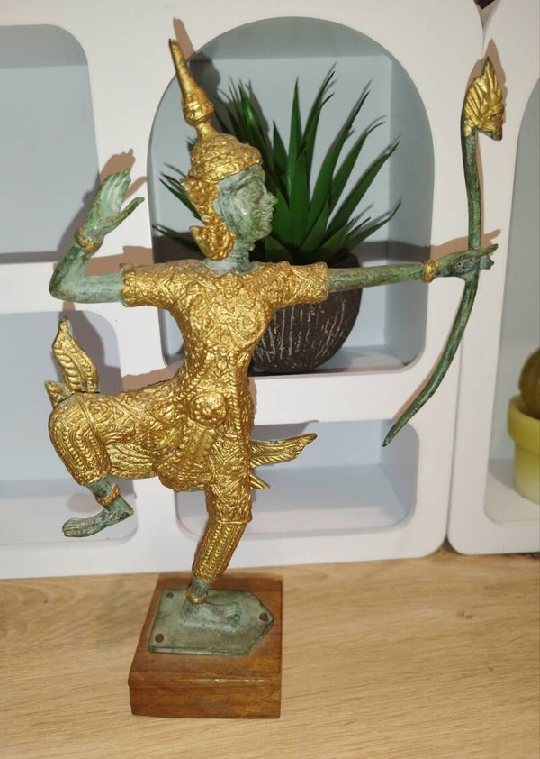 "Superbe statue en bronze représentant un archer divin de la mythologie thaïlandaise. La figure, richement ornée d'or, est figée dans un mouvement de danse gracieux tout en brandissant un arc. Les détails sont finement ciselés, notamment le visage aux traits délicats et l'expression concentrée. La patine verte du bronze contraste élégamment avec les dorures, ajoutant une touche d'authenticité. La statue repose sur un socle en bois. Pièce unique, idéale pour les collectionneurs d'art asiatique ou pour décorer un intérieur exotique. Dimensions : [Hauteur] :24,7 x [Largeur ] 17 cm poids 604 gm . État : Excellent état de conservation."