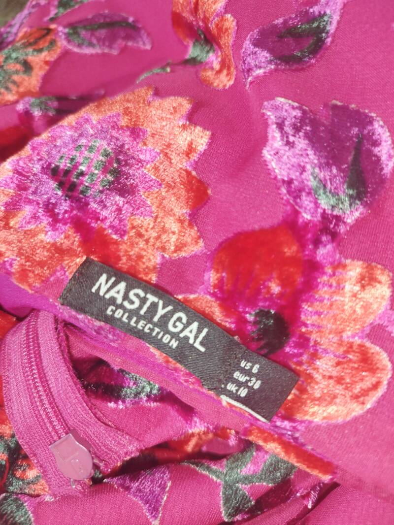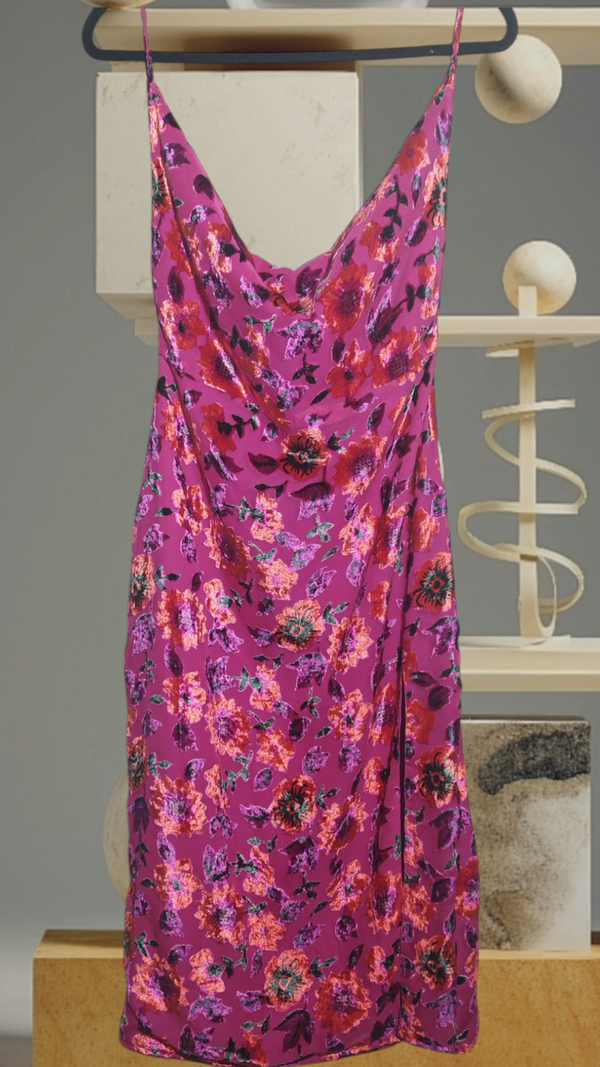 robe en velours dévoré est un modèle mi-long offrant un col et un dos bénitiers, des bretelles ajustables, une fente à l'avant, des motifs fleuris ainsi qu'une fermeture à glissière sur le côté.