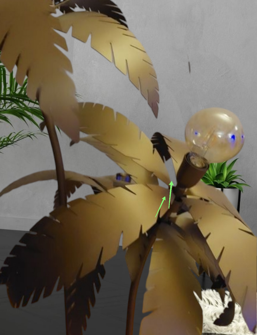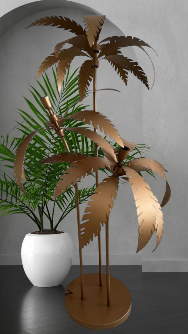 lampe palmier maison du monde aspect bronze trois pieds , lampe neuf en très bon état , sauf que sur certaines feuille palmes ou la peinture à un peu bougé c'est le point négatif de ses sur cette collection lampe palmiers mais pas très visible Elle apportera une touche EXOTIQUE et ÉLÉGANCE