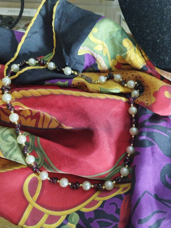 Collier IL S'AGIT D'UN COLLIER INCROYABLEMENT AUTHENTIQUE SIGNÉ YR GOLD TON, PERLE ET GRENAT.