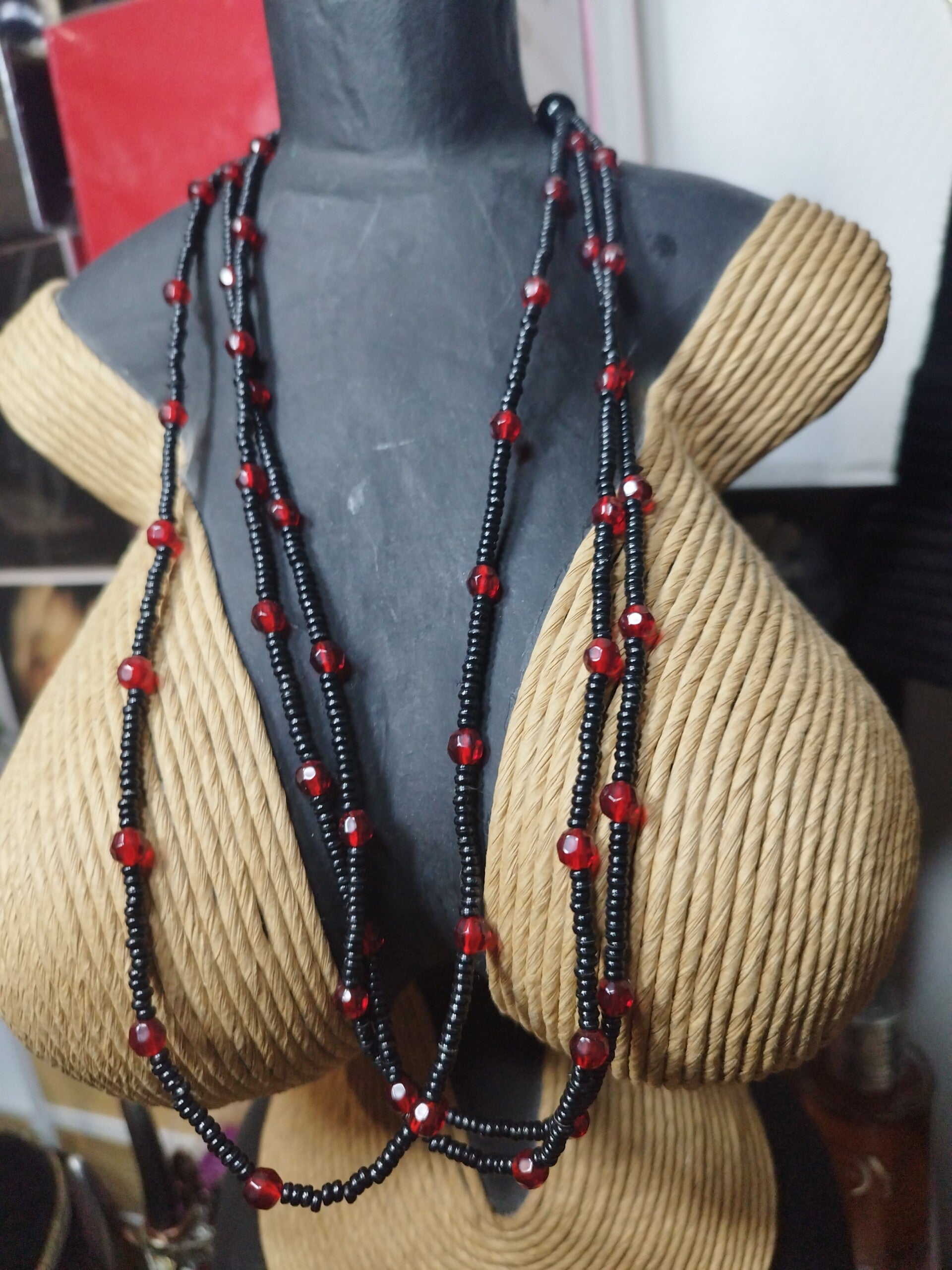 Collier Vintage trois range en perles d'onyx noir et véritables CERISE ROUGE À FACETTES