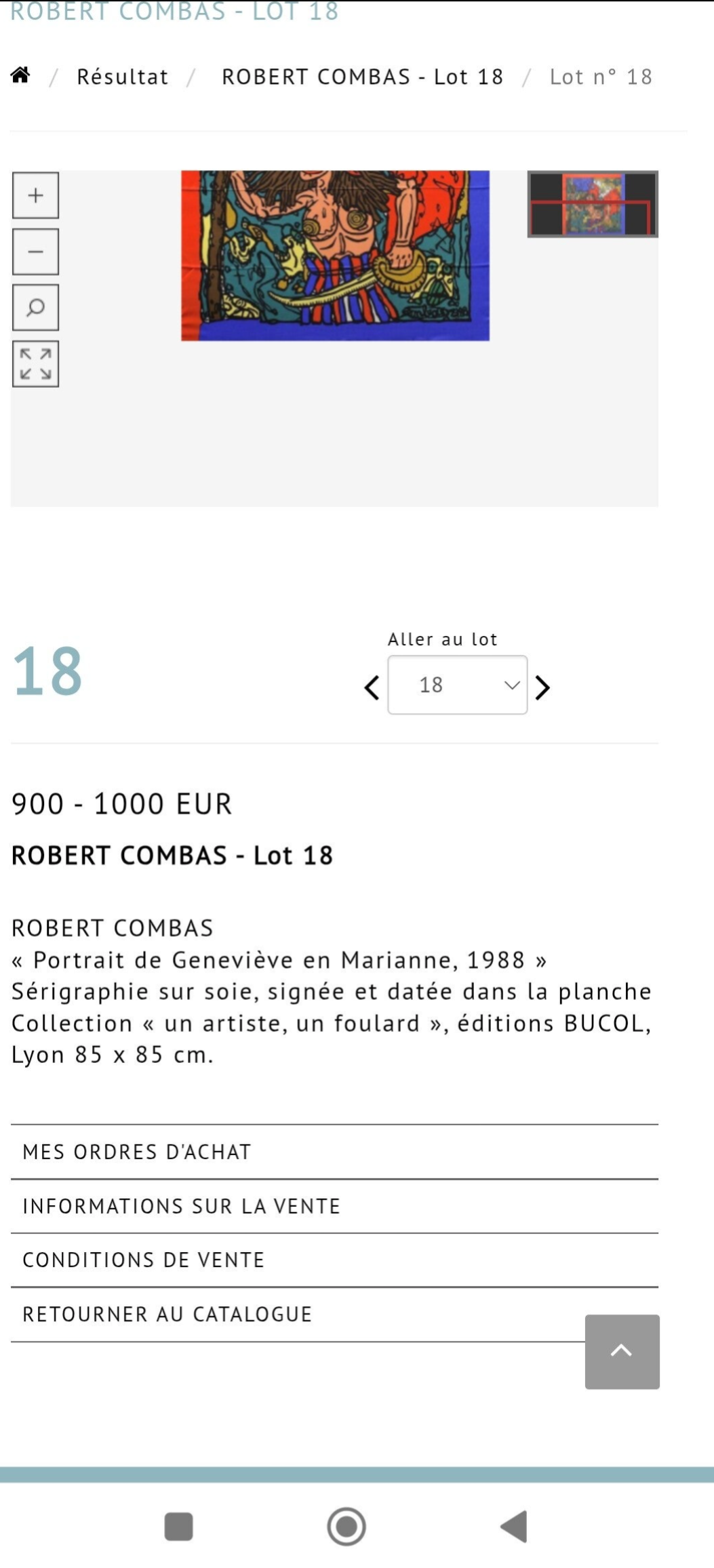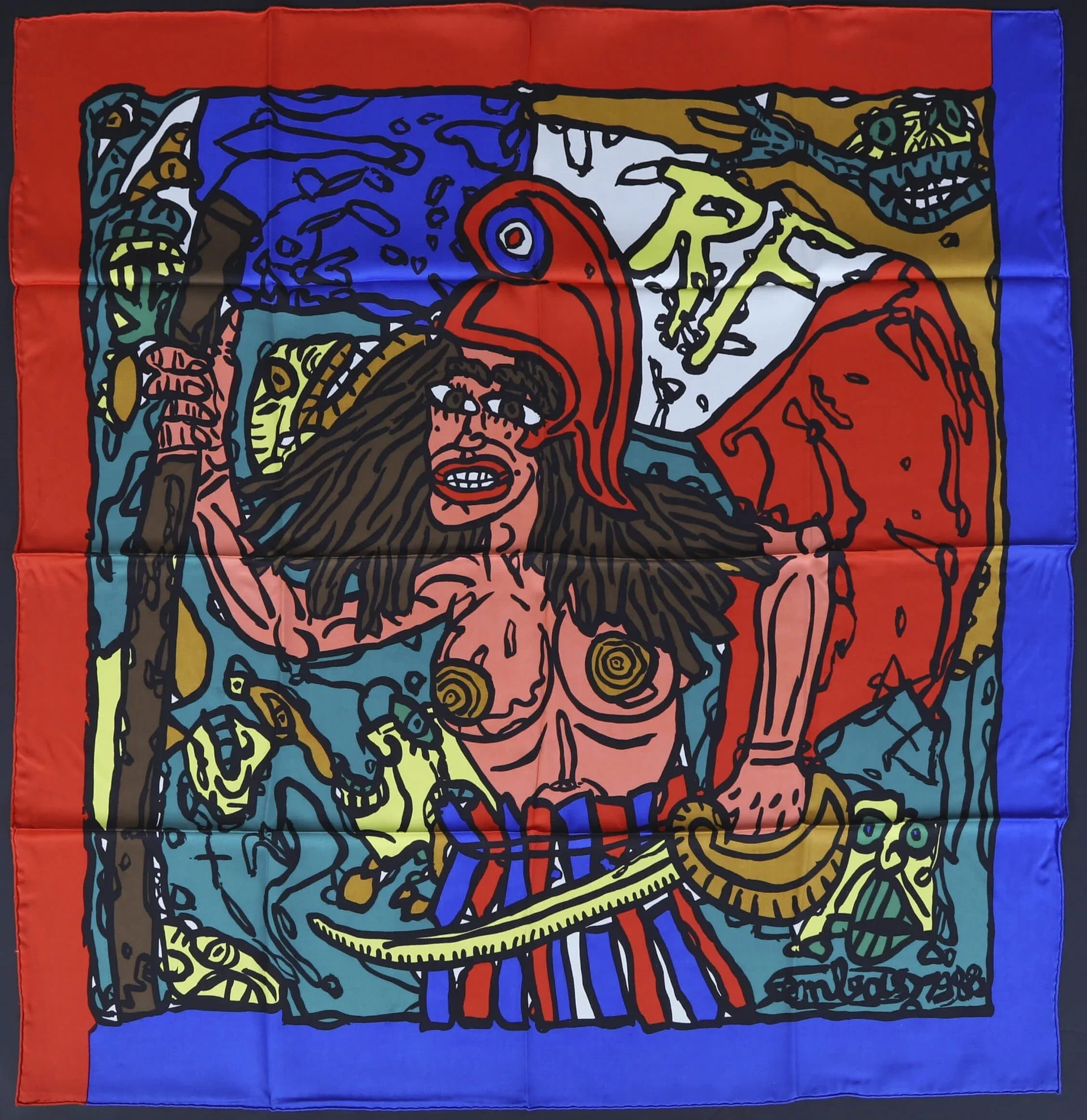 Robert COMBAS (né en 1957). Portrait de Geneviève en Marianne - 1988. Foulard. Sérigraphie sur soie marouflée sur toile. Bucol éditeur à Lyon (Collection << Un artiste un foulard »). Signé et daté (dans la planche) en bas à droite. 83 x 83 cm