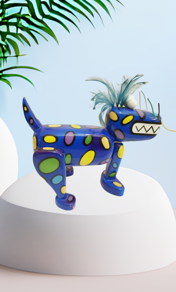 Une des créations du Zedo Zoo de Drew Elwood. Ce chien funky est un démarreur de conversation coloré. Remarque: écrit sous le pied:(Designed by Drew Ellwood for MiracleDREAMS