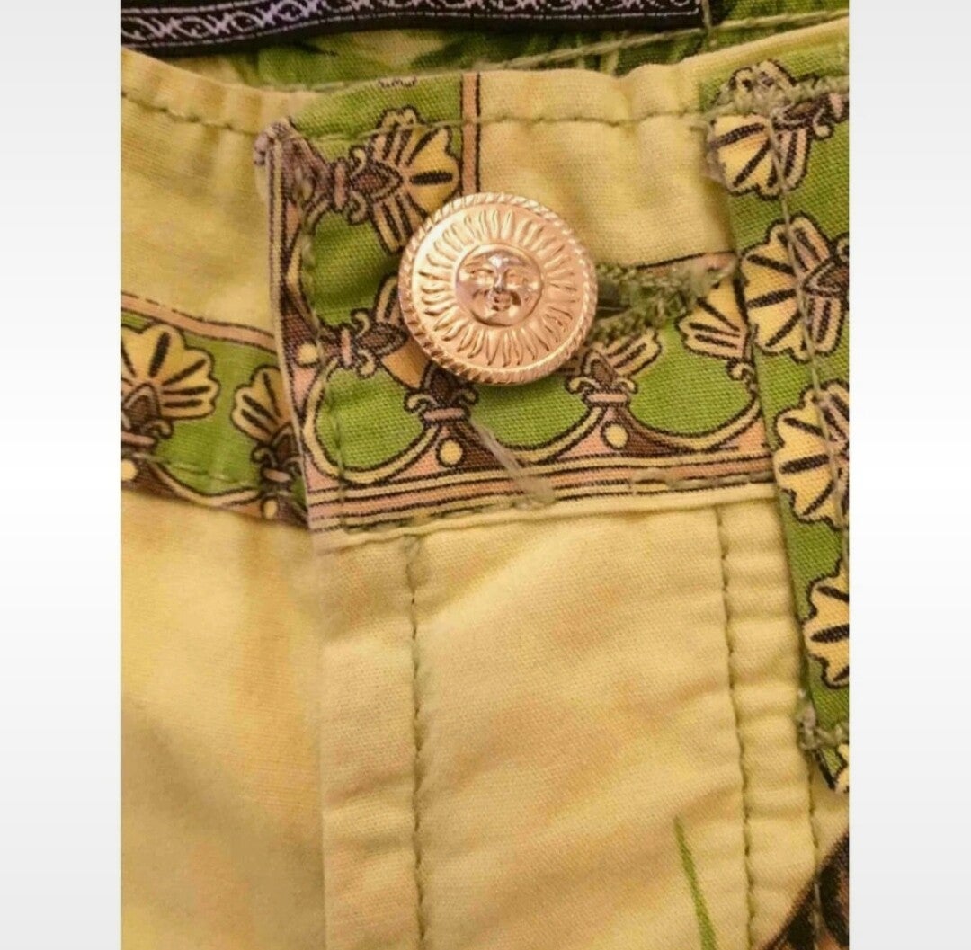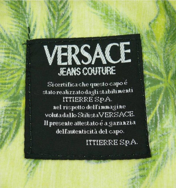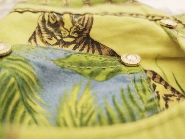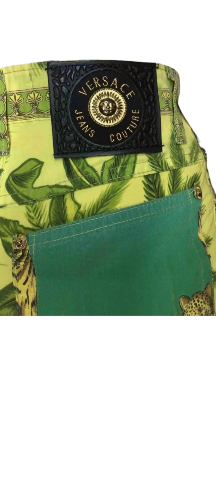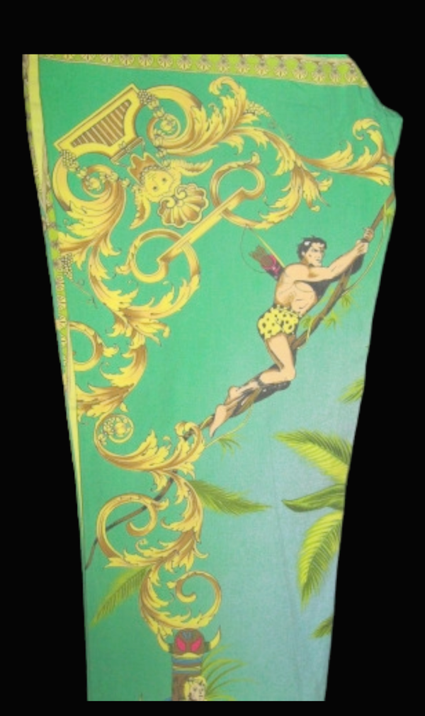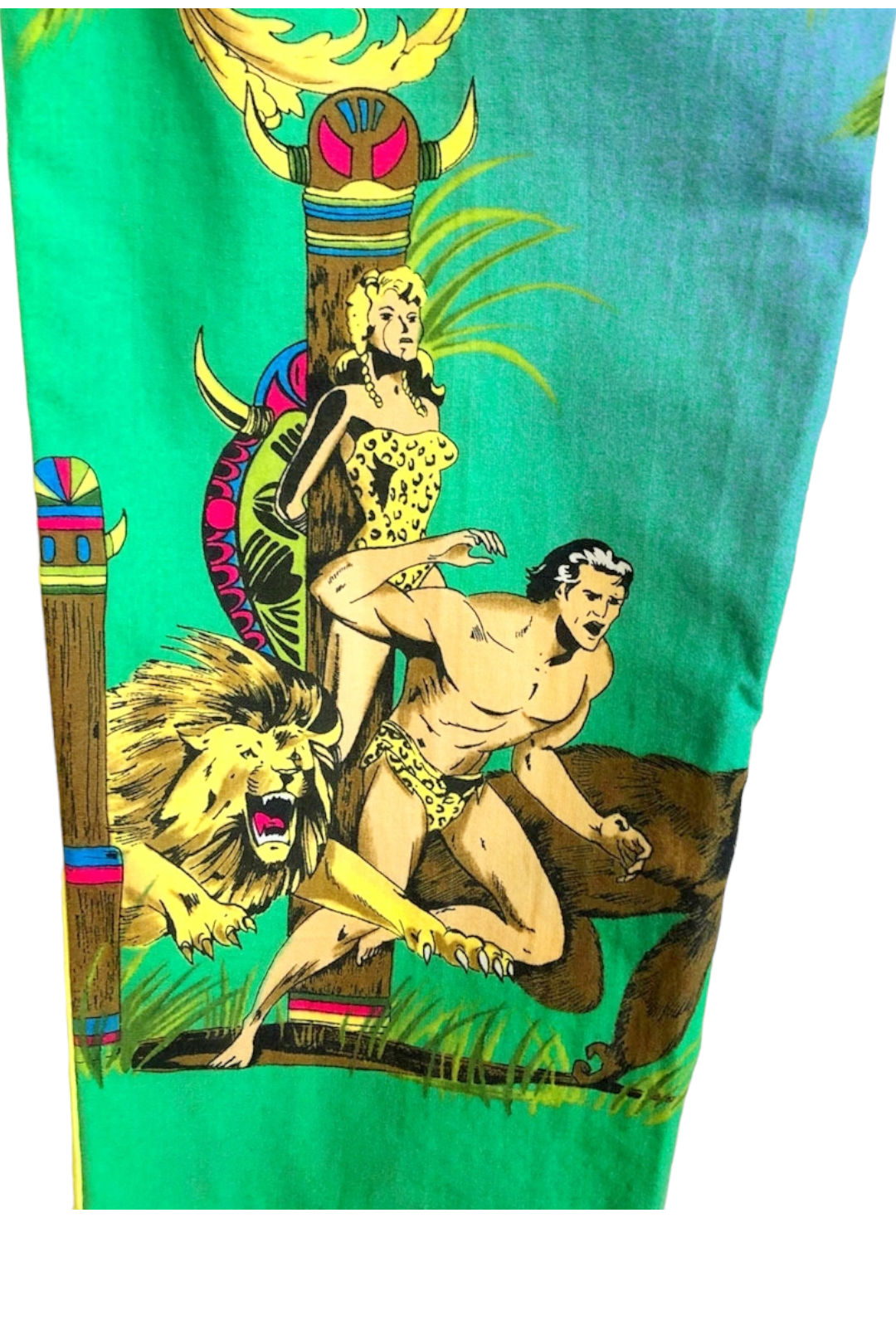* Ce pantalon Versace vintage imprimé exotique des années 26-11 1973 illustre des lions, des léopards, des tigres, Tarzan et Jane entourée d'un feuillage tropical luxuriant. Les graphismes tropicaux sont illuminés par des teintes de verts vibrants et de bleu aqua et sont accentués par des bordures festonnées jaune doré.